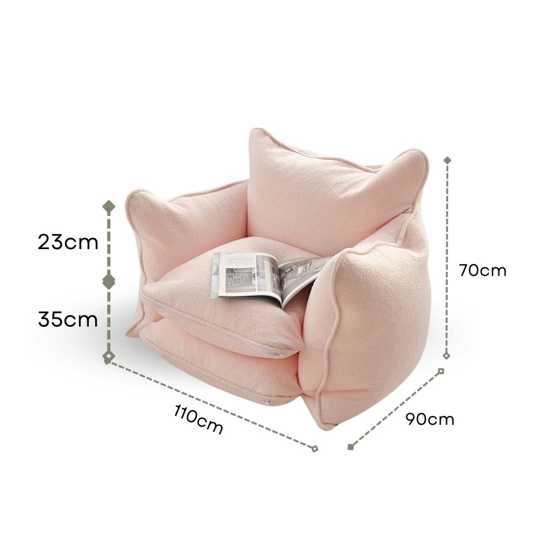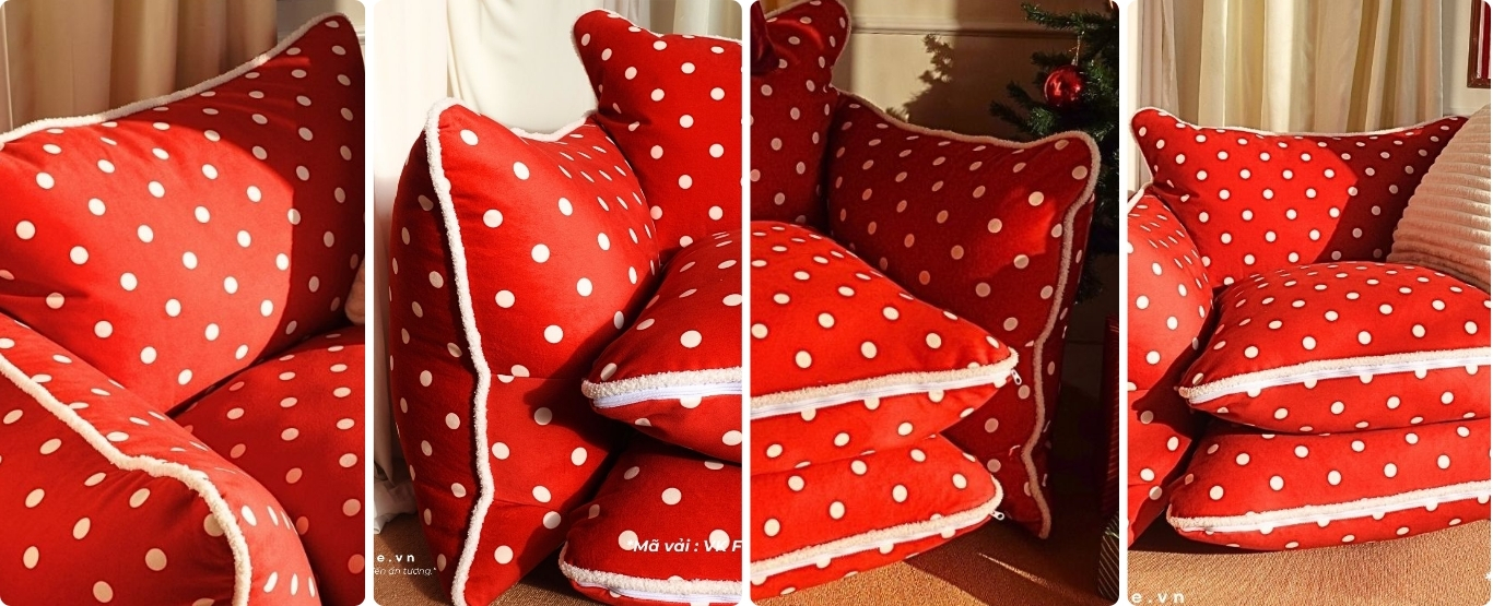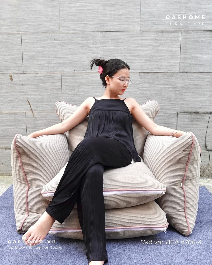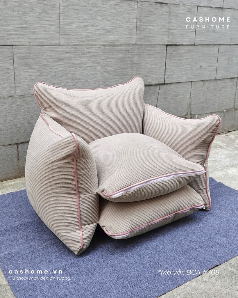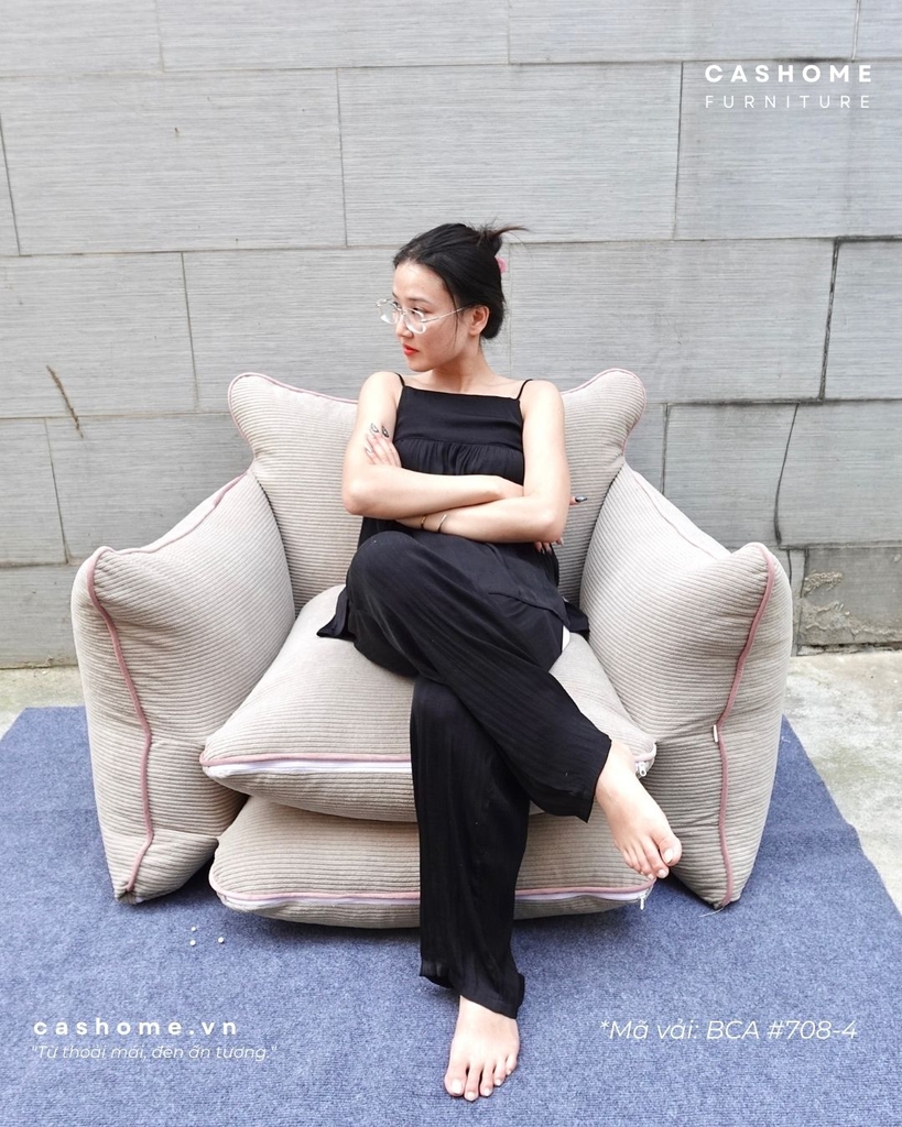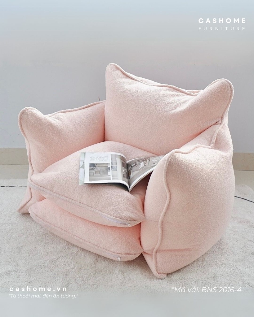 Vỏ được tuỳ chọn trên trăm mẫu vải/da đủ chất liệu và tính năng. Ruột là hạt xốp đàn hồi siêu nhẹ. Kết cấu vỏ chia ngăn đứng form, có thể rút/fill xốp và giặt vỏ dễ dàng, có túi trữ hạt xốp riêng (theo nhu cầu)